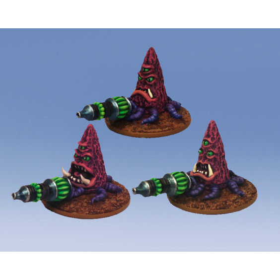 Pack contains 3 Slishian Gunner models comprised of 3 Slishian face/bodies and 3 tentacle gun bases. Miniature supplied unpainted and unassembled. Bases not included. Sculpted by Matt Beauchamp. Display models painted by Matt Beauchamp.