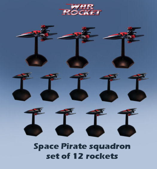 This pack contains a total of 12 rockets: 9 Space Pirate class 1 rockets, 3 Space Pirate class 2 rockets and 12 flight bases. You save 10% by purchasing this box instead of purchasing separately. Miniature supplied unpainted and unassembled. Sculpted by David Leppink. Display Models painted by Matt Beauchamp.