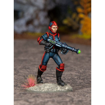This pack contains one Space Pirate female trooper 3 model comprised of one Space Pirate body and one sprue with raygun and two heads with cowls. These models have separate heads so you can customize them with the Space Pirate alternate helmets sold separately. Miniature supplied unpainted and unassembled. Base not included. Sculpted by Ari Nielsson. Display model painted by Matthew Leahy.